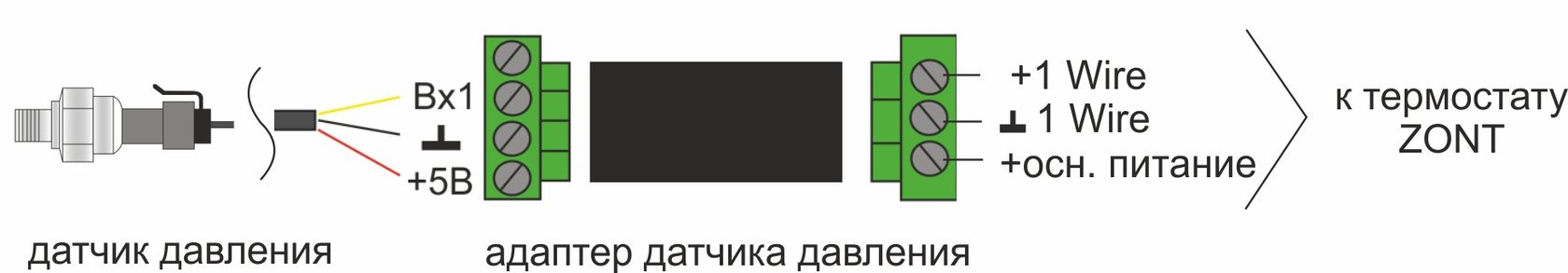Адаптер Датчика Давления подключается приборам ZONT по интерфейсу 1-Wire. аналогично датчикам температуры DS18S20 / DS18B20. Основное питание равное 12-24В на АДД подается отдельным проводом от прибора автоматики ZONT.